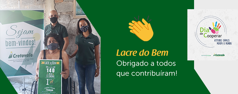Lembramos que para adquirir uma cadeira de rodas são necessários 385 mil lacres. Essa quantidade equivale a encher 140 garrafas pet de dois litros. E isso só é possível com a cooperação e solidariedade dos cooperados e familiares, o que demonstra o quanto os cooperados da Cretovale estão envolvidos com as ações de voluntariado do Dia C.