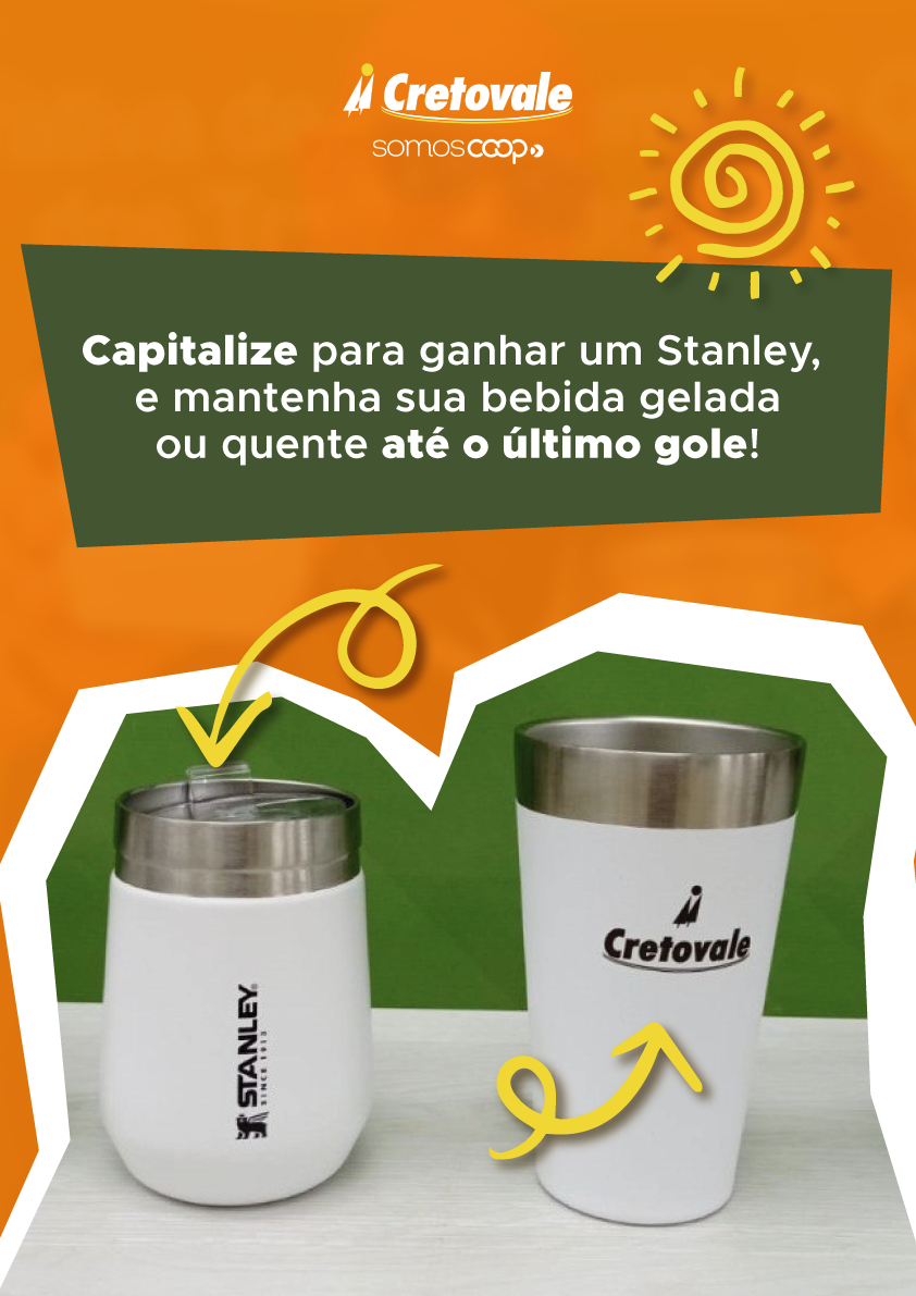 Estamos falando do copo térmico Stanley, sonho de consumo dos brasileiros, por manter a sua bebida gelada ou quente até o último gole. Para ganhar o copo Stanley é só capitalizar. A capitalização fortalece a Cretovale e aumenta o seu capital na cooperativa. Além disso, seu capital é remunerado anualmente.
