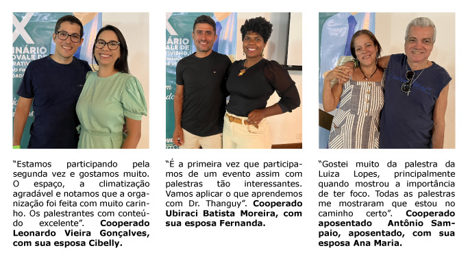 O seminário foi aberto pelo presidente Celso Rodrigues, que agradeceu a presença de todos, enfatizando a retomada dos eventos sociais com força total, após a pandemia, a pedido dos cooperados. O presidente agradeceu, também, a presença de Victor Lima, acompanhado de sua esposa, representando o Sistema OCB-SESCOOP/ES. Os palestrantes com grande carisma, técnica e sabedoria envolveram a plateia com temas especialmente preparados para o evento e com aplicação no dia-a-dia.